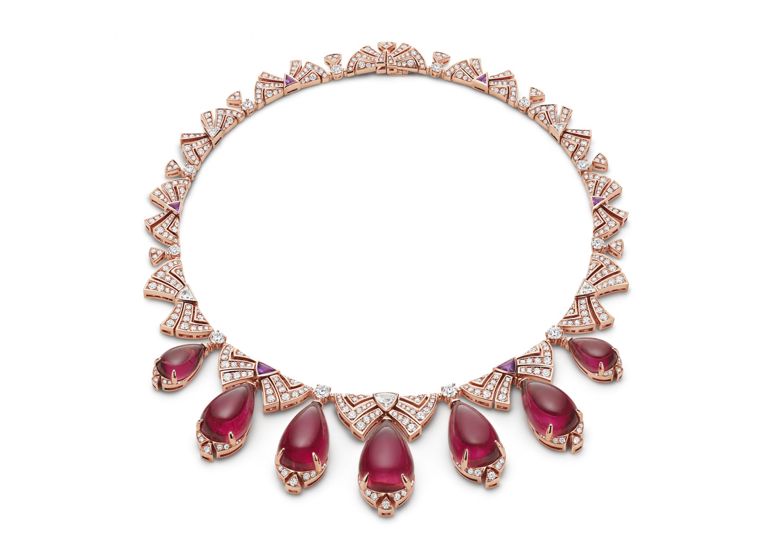 Cette année, de nouvelles créations qui laissent exploser les couleurs, à l’image d’un feu d’artifice, donnent le ton et rappellent que le joaillier romain est l’indétrônable maître de la couleur. Rubellites, tourmalines et spinelles aux reflets incandescents en tailles cabochon, poire, ovale, coussin ou octogonale donnent naissance à des colliers, des bagues volumineuses et des boucles d’oreilles qui ne laissent pas indifférents. Les nuances rougeoyantes de ces gemmes sont mises en valeur par le vert des émeraudes et des tourmalines, le noir de l’onyx, le violet des améthystes, l’orangé saturé du corail et la blancheur des diamants.