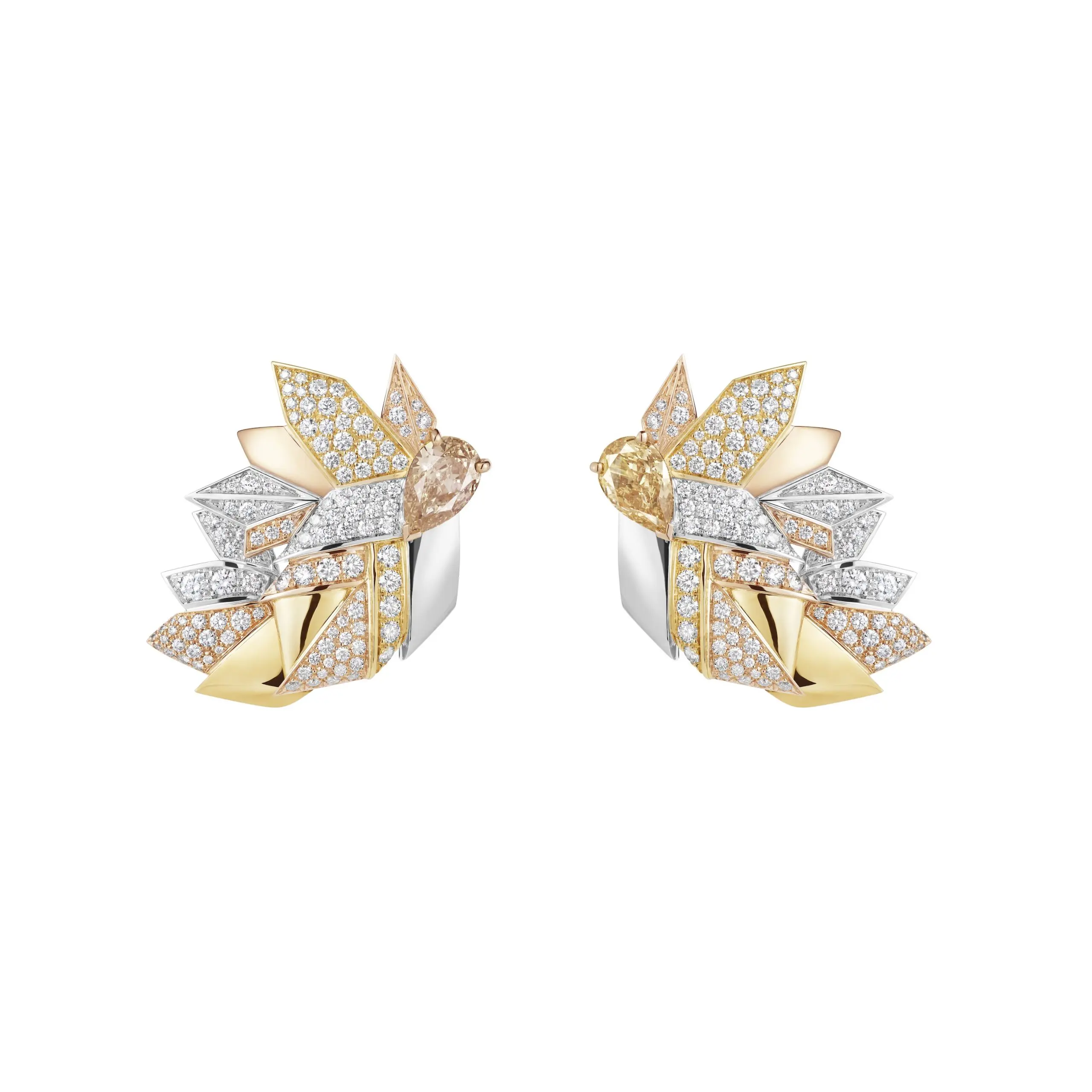 Plus abstraites, les boucles d’oreilles et la bague Maple Colours, à la géométrie parfaite, stylisent les feuilles de l’arbre national emblématique du Canada, un pays dont les toundras regorgent de diamants. Alliant or blanc, or jaune et or rose, pour rappeler les couleurs changeantes des saisons, ces créations accueillent des diamants de couleur aux reflets orangés, enchâssés au sein de feuilles d’érable en origami, dont les textures évoquent la délicatesse des feuilles mortes.