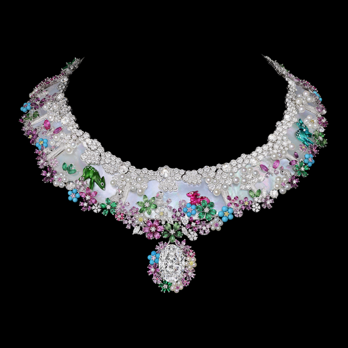 Le soir, les jardins se font majestueux. Le ciel nocturne est de lapis, les étoiles, de diamants, et les arbres, d’émeraudes et d’or. Comme à son habitude, la créatrice sature de mille teintes les pièces uniques de ce nouvel opus. Elle fait danser diamants blancs et jaunes, émeraudes, saphirs jaunes et roses, spinelles orange, grenats tsavorites et rhodolites, topazes impériales et dorées, perles de culture blanches, turquoises… Certains bijoux révèlent toute la virtuosité des ateliers, qui utilisent, outre la technique du doublet d’opale, le procédé de plique-à-jour, qui permet, grâce à l’utilisation de la laque, de créer une sorte de vitrail miniature, à travers lequel la lumière passe avec douceur.