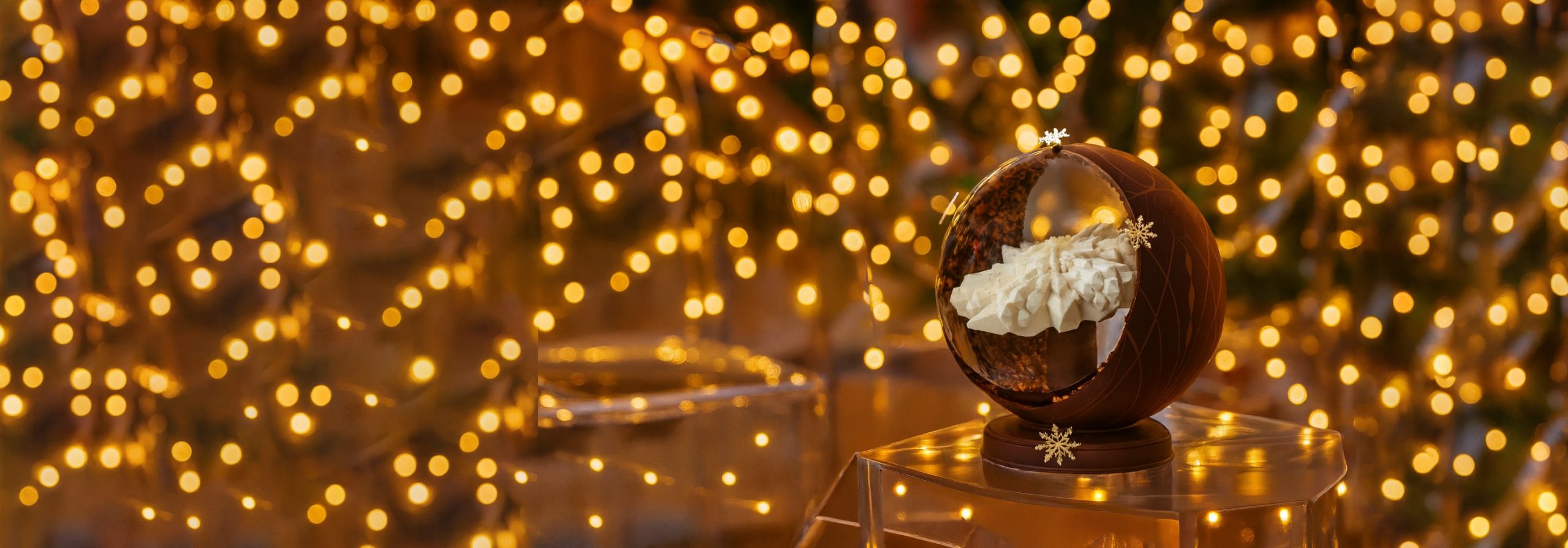 Fraîchement arrivé au Bristol, Maxence Barbot revisite la silhouette du sapin, dont les courbes gracieuses sont soulignées par le chocolat au lait de Madagascar étincelant d’éclats dorés.